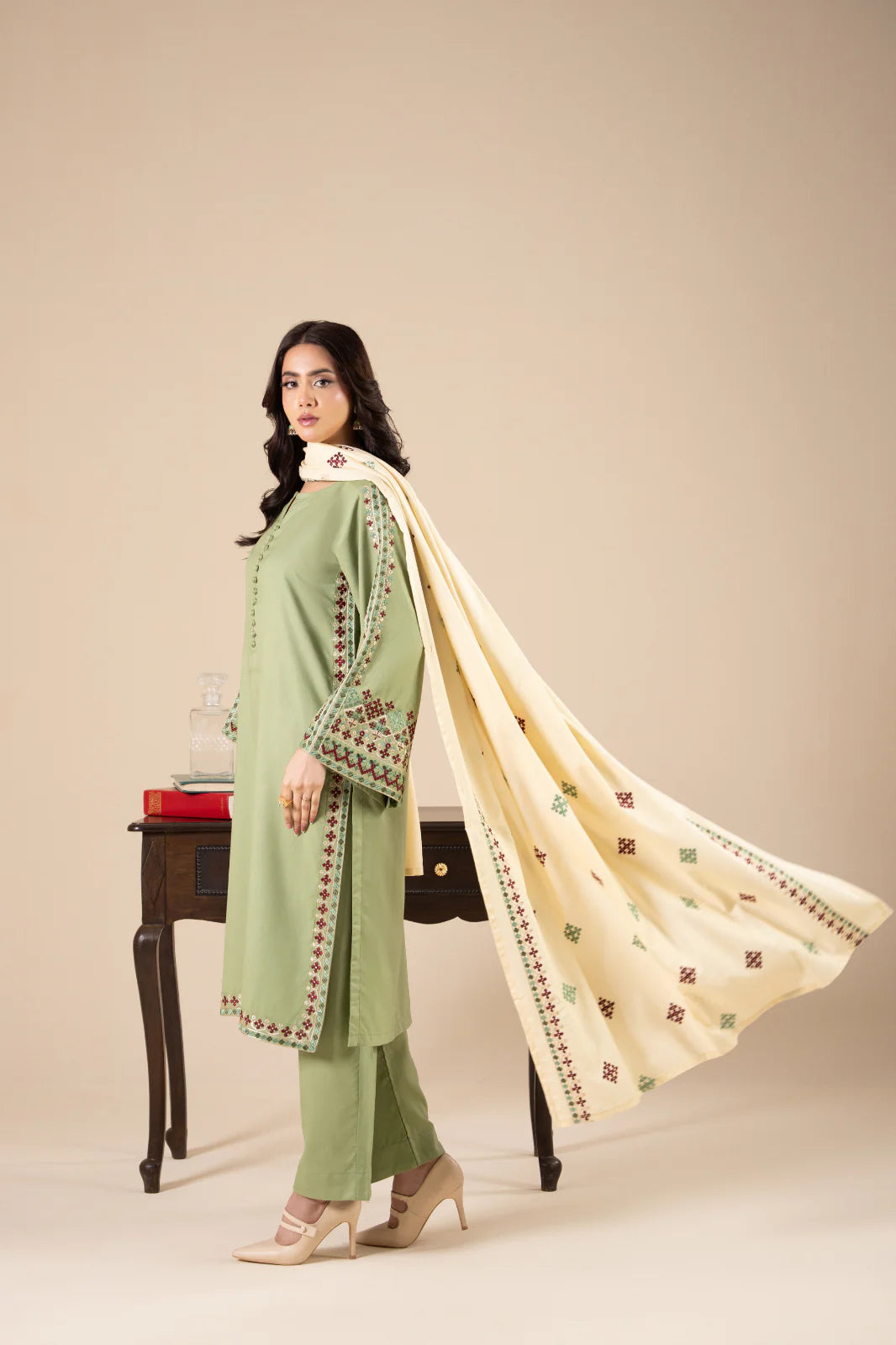 Premium Sage Green 3-Piece Suit with Geometric Embroidery & Cream Dupatta