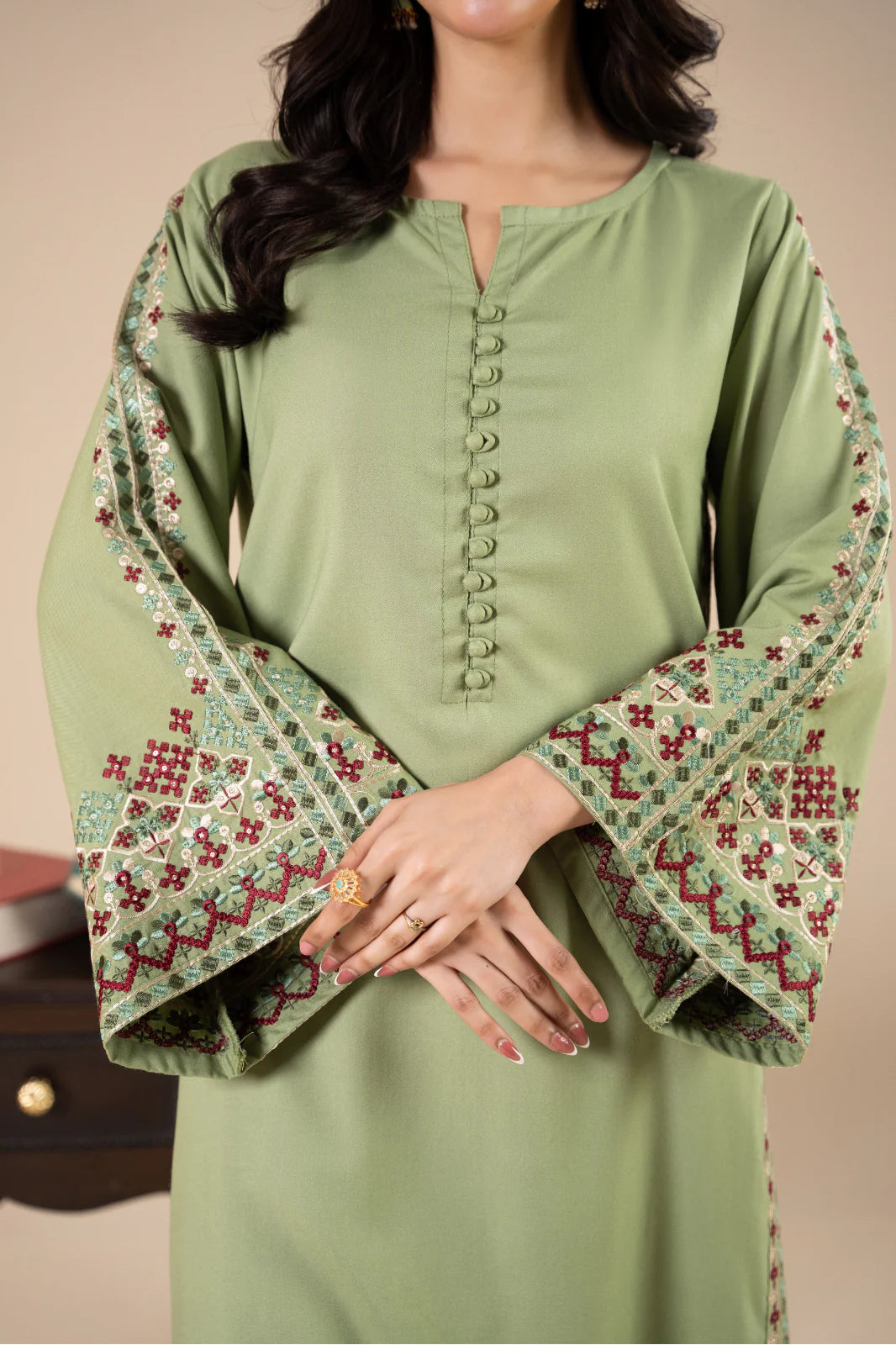 Apne style ko ek naya aur tazgi bhara mod dein! Ye Sage Green (Pistachio) suit un khawateen ke liye behtareen hai jo sophisticated aur calm colors pasand karti hain. Is kurta par sleeves aur daman par bohot hi nafees Cross-stitch style geometric embroidery ki gayi hai, jo maroon aur green...